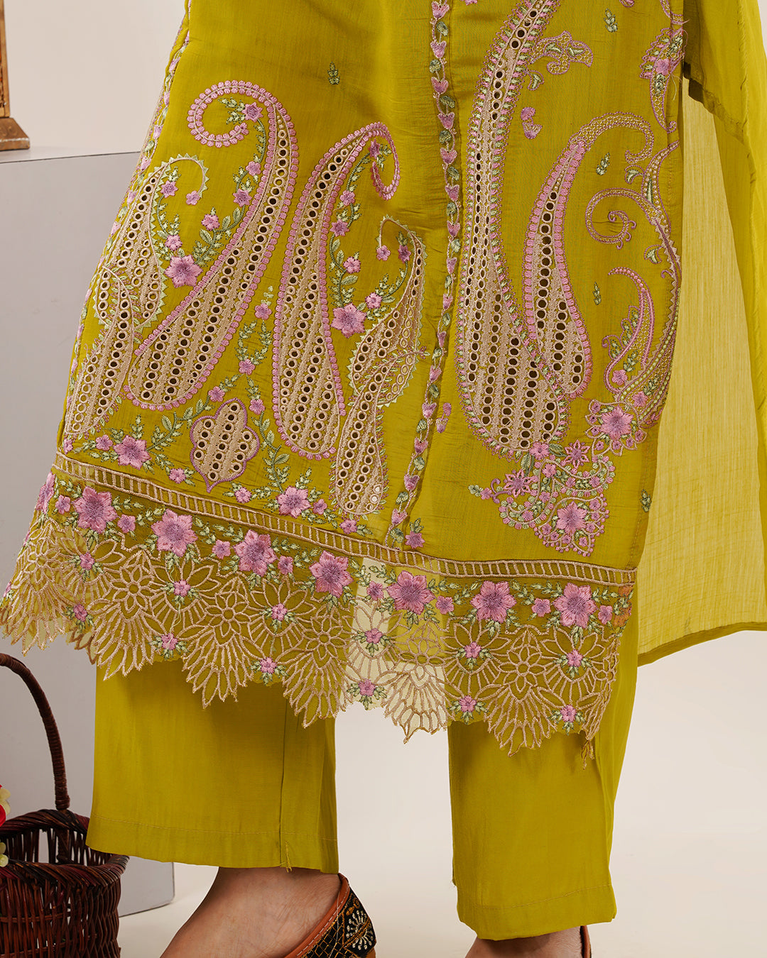 Grace every occasion with this luxurious olive-green three-piece suit. The kurta is adorned with intricate pastel embroidery in soft pink and lavender hues, highlighted with delicate cutwork on the sleeves and hemline. A coordinating chiffon dupatta with contemporary polka-dot patterns in gold and lilac adds a modern twist, while matching straight pants provide a polished finish.